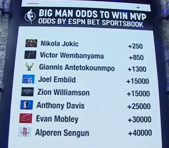 10月15日讯 今日博彩网站更新了NBA新赛季大个子球员拿下MVP的赔率,具体如下: