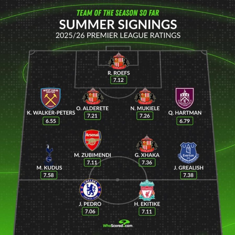 10月14日讯 英超7轮战罢,WhoScored评出了由今夏新援组成的最佳11人阵容,三名桑德兰球员入选(数据为联赛数据)。