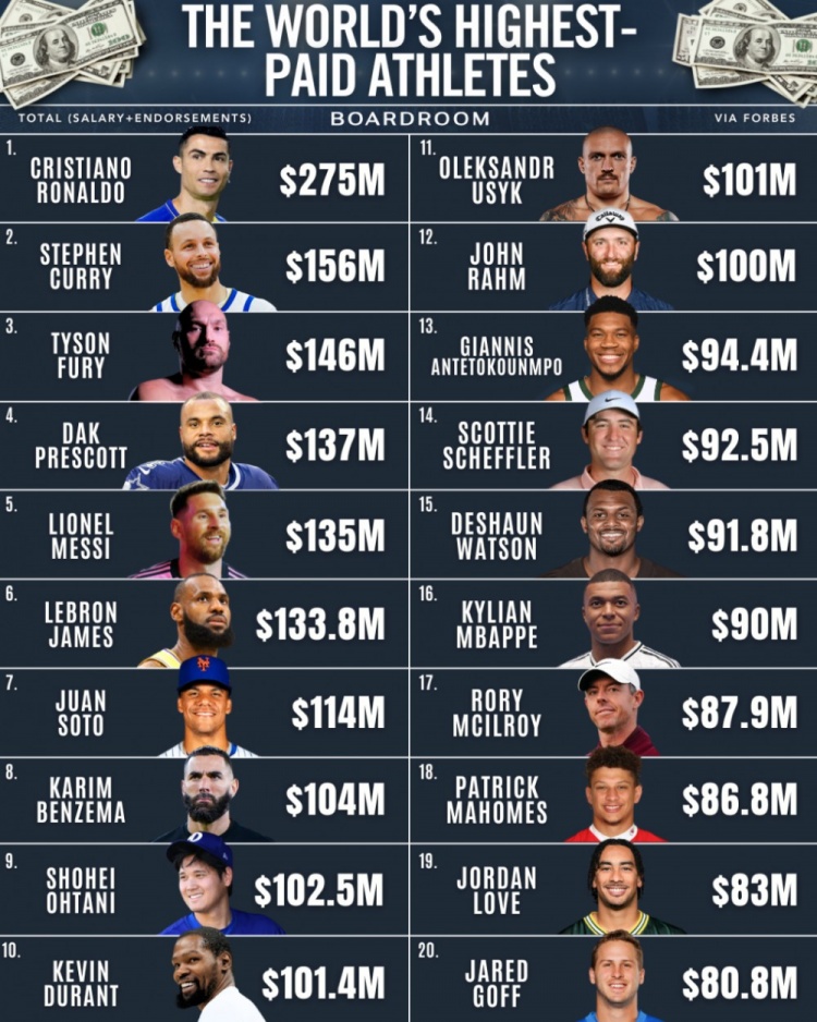 世界收入最高运动员:C罗2.75亿断档第1&库里1.56亿第2 詹姆斯第6