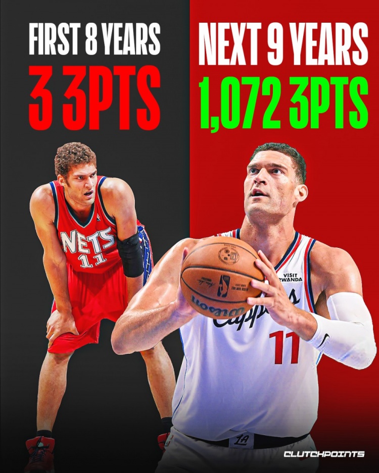 根据统计,他生涯前八个赛季,一共是31投3中的三分。而在第九个赛季、也就是16-17赛季,他就暴增至387投134中。从16-17赛季开始至上赛季的九个赛季里,他三分合计是3024投1072中。