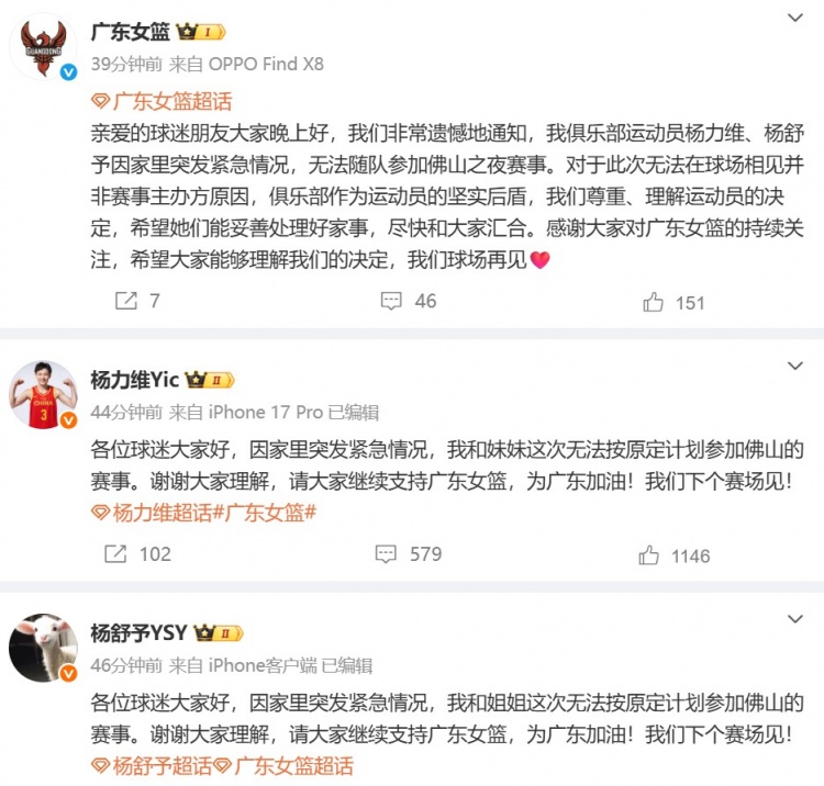 官方原文写道:“亲爱的球迷朋友大家晚上好,我们非常遗憾地通知,我俱乐部运动员杨力维、杨舒予因家里突发紧急情况,无法随队参加佛山之夜赛事。对于此次无法在球场相见并非赛事主办方原因,俱乐部作为运动员的坚实后盾,我们尊重、理解运动员的决定,希望她们能妥善处理好家事,尽快和大家汇合。感谢大家对广东女篮的持续关注,希望大家能够理解我们的决定,我们球场再见❤️”