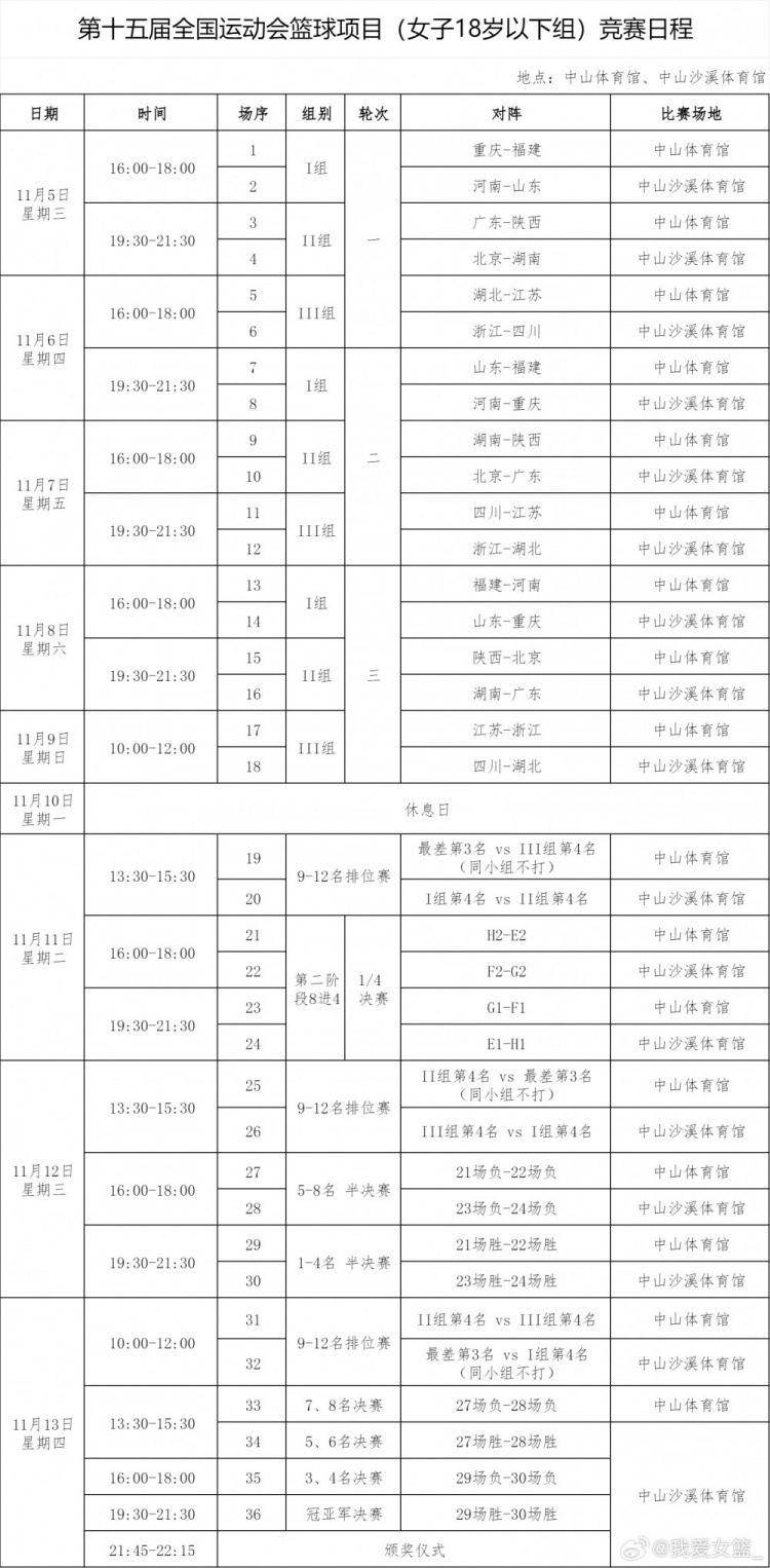 全运会女篮完整赛程出炉,小组赛将在5天内打完,随后进行淘汰赛以及排位赛阶段的比赛,大部分球队5天打3场小组赛还是较为宽松的,但由于中国香港参加全运会女篮成年组的比赛,因此和她们同组的球队,需要在5天内打完4场小组赛。具体赛程如图: