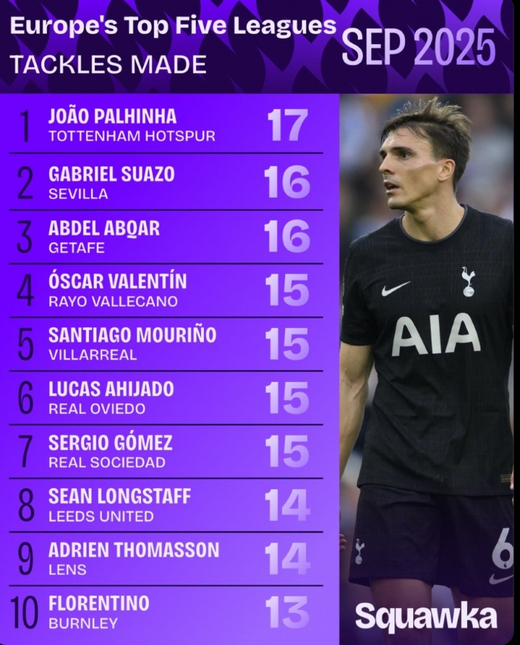 10月1日讯 今天,数据机构Squawka在社媒公布了九月份铲球榜,热刺中场帕利尼亚以17次成功铲球位居榜首。