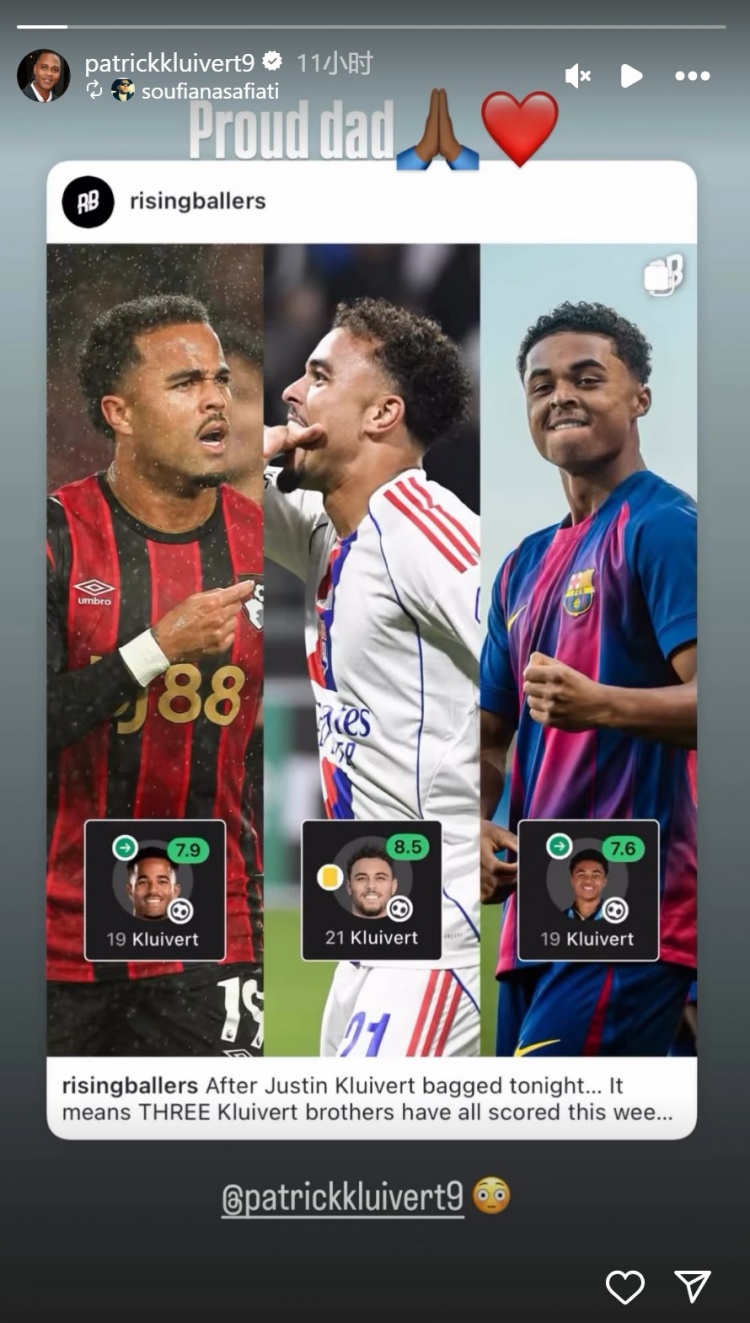帕特里克-克鲁伊维特社媒转发相关新闻,庆祝三个儿子齐发威,配文:“骄傲的爸爸。”