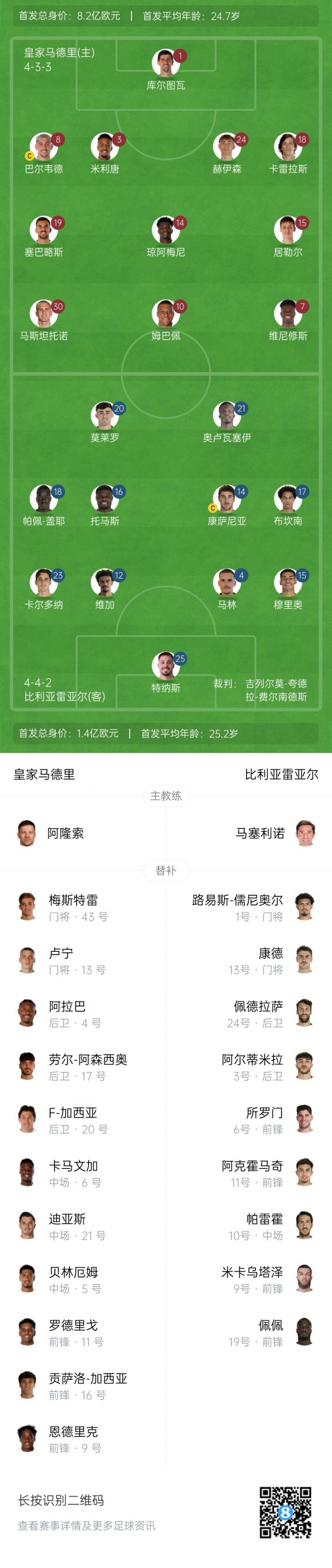 皇马首发:1-库尔图瓦、8-巴尔韦德、3-米利唐、24-赫伊森、18-卡雷拉斯、14-琼阿梅尼、19-塞巴略斯、30-马斯坦托诺、15-居勒尔、7-维尼修斯、10-姆巴佩