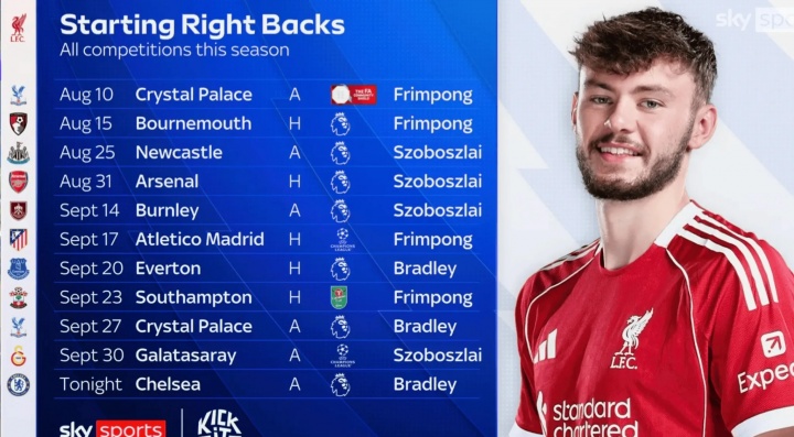 此役布拉德利担任利物浦首发右后卫,据天空体育统计,本赛季利物浦没有任何右后卫连续4场首发。