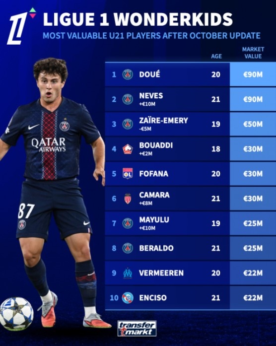 法甲U21球员身价榜:杜埃、若昂-内维斯9000万欧并列榜首