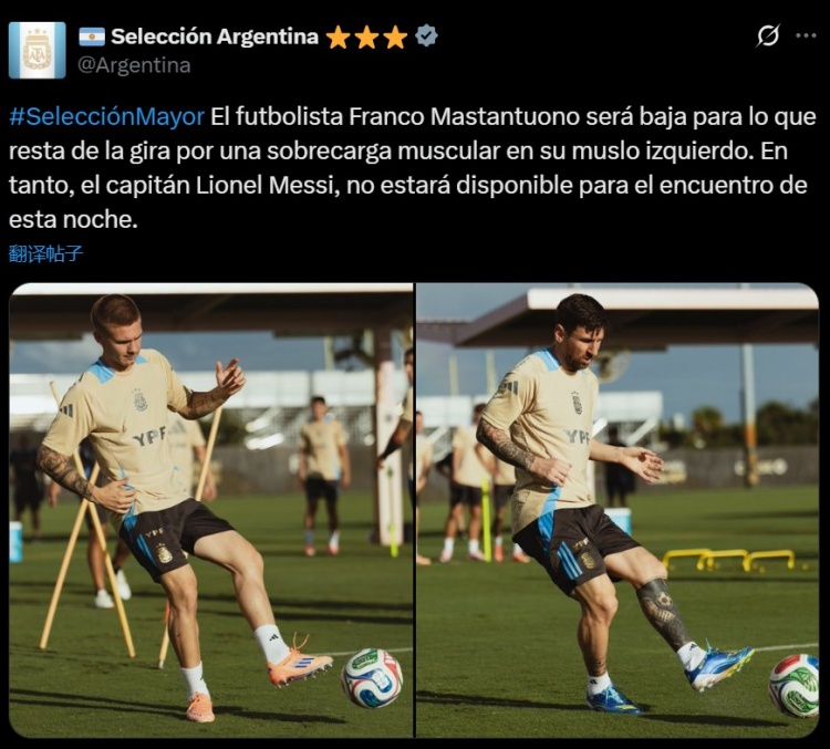 阿根廷官方写道:“球员马斯坦托诺的左大腿肌肉过度疲劳,将缺席接下来的巡回比赛。与此同时,队长梅西也将缺席今晚的比赛。”