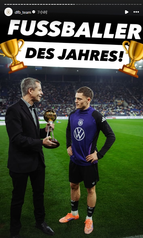 上赛季45场16球15助!维尔茨今日赛前领取德国足球先生奖杯