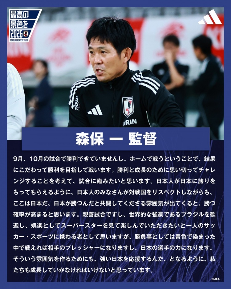 “虽然只是一场国际友谊赛,但对手巴西队是世界顶级球队。我们欢迎他们的到来,不过比赛事关胜负,如果我们的主场被蓝色的海洋所覆盖,那也会给对手带来压力,同时成为日本队的助力。希望球迷们能够营造起氛围,为日本队提供强有力的支持,这也和我们的成长息息相关。”